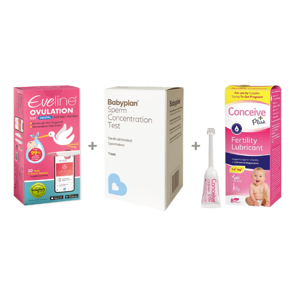 Komplet tre-i-én pakke med Eveline Smart Fertilitetssystem, Babyplan Sædkvalitetstest og Conceive Plus (8 x 4g) – alt hvad I behøver for at optimere timingen og miljøet for begge partnere.