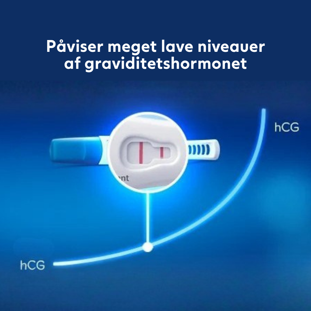 - Test op til 6 dage før forventet menstruation — det vil sige 5 dage før udebleven menstruation. Følsomhed 10 mIU/mL. Bemærk: ved tidlig testning er sandsynligheden for påvisning lavere — ved negativt tidligt resultat anbefales at teste igen på dagen for forventet menstruation