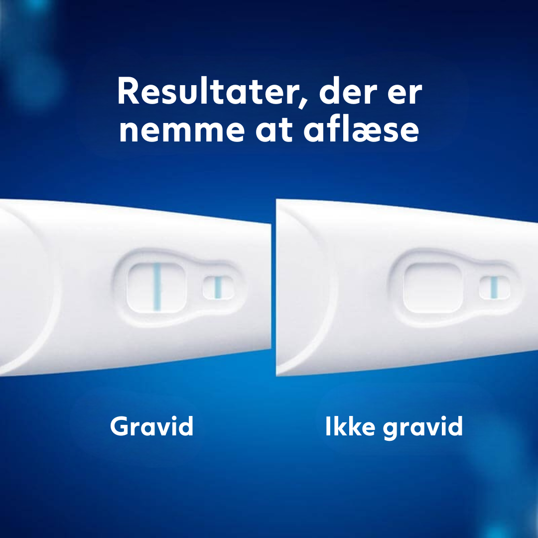 - Har et tydeligt og enkelt design med 2 streger, hvis du er gravid, og 1 streg, hvis du ikke er gravid.
