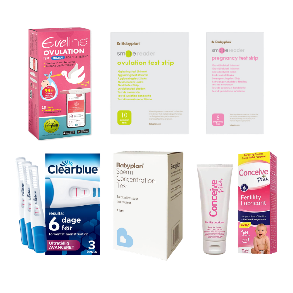 Komplet fertilitetskit med Eveline, Smile Reader, Clearblue Ultratidlig Avanceret 3-pak, Babyplan Sædkvalitetstest og Conceive Plus 75ml – alt hvad I behøver for at tage kontrol fra dag ét.